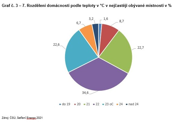 Graf č. 3 – 7. Rozdělení domácností podle teploty v oC v nejčastěji obývané místnosti v %