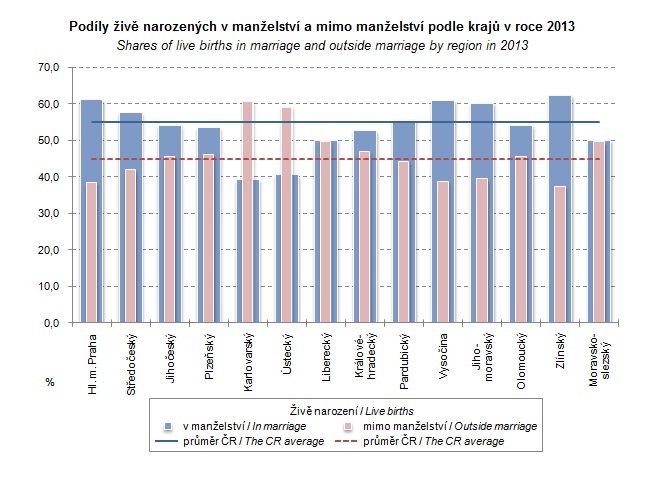 Graf 4-2. Podíly živě narozených v manželství a mimo manželství podle krajů v roce 2013