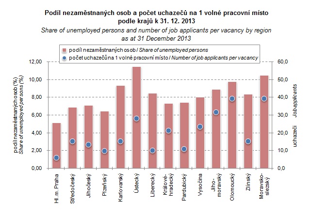 Graf 9-2. Podíl nezaměstnaných osob a počet uchazečů na 1 volné pracovní místo podle krajů k 31. 12. 2013