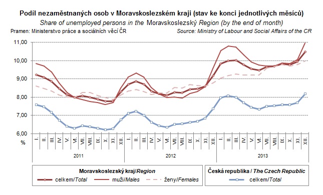 Graf 9-3. Podíl nezaměstnaných osob v Moravskoslezském kraji