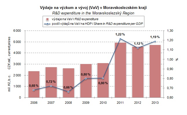 Graf 19-1. Výdaje na výzkum a vývoj v Moravskoslezském kraji