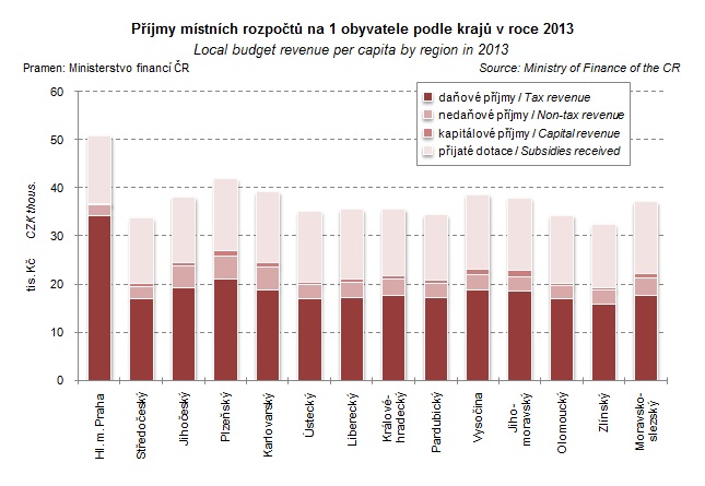 Graf 6-2. Příjmy místních rozpočtů na 1 obyvatele podle krajů v roce 2013