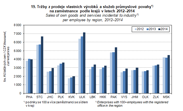 Graph 19. Sales of own goods and services incidental to industry per employee by region, 2012–2014