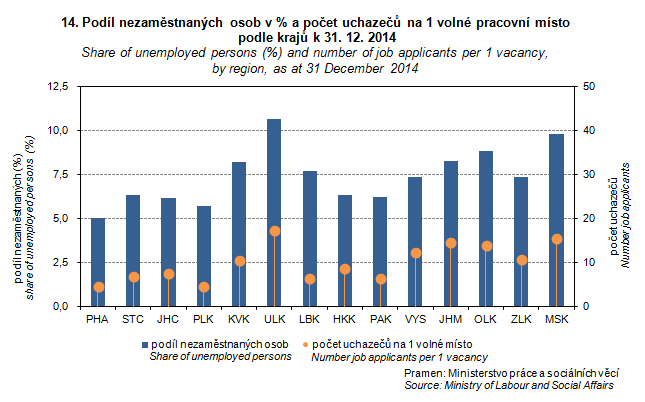 Graph 14. Share of unemployed persons (%) and number of job applicants per 1 vacancy, by region, as at 31 December 2014