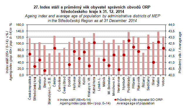 Graph 27. Ageing index and average age of population by administrative districts of MEP in the Středočeský Region as at 31 December 2014