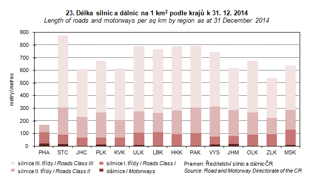 Graph 23. Length of roads and motorways per sq km by region as at 31 December 2014