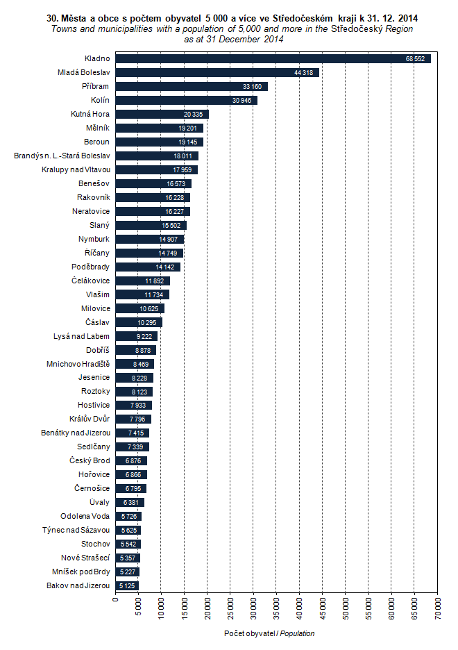 Graph 30. Towns and municipalities with a population of 5,000 and more in the Středočeský Region as at 31 December 2014