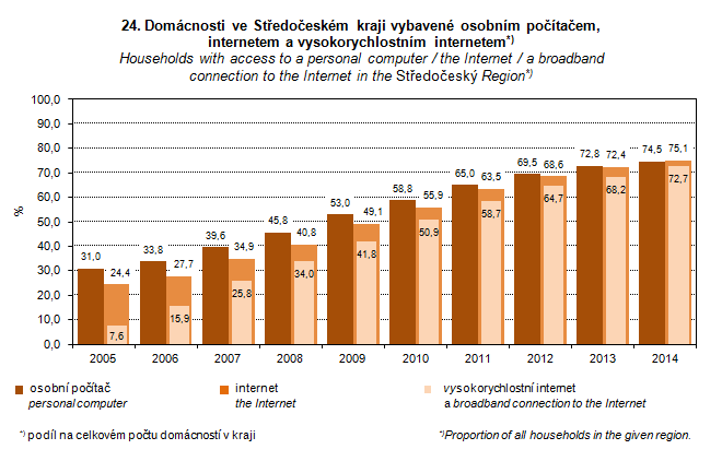 Graph 24. Households with access to a personal computer / the Internet / a broadband connection to the Internet in the Středočeský Region