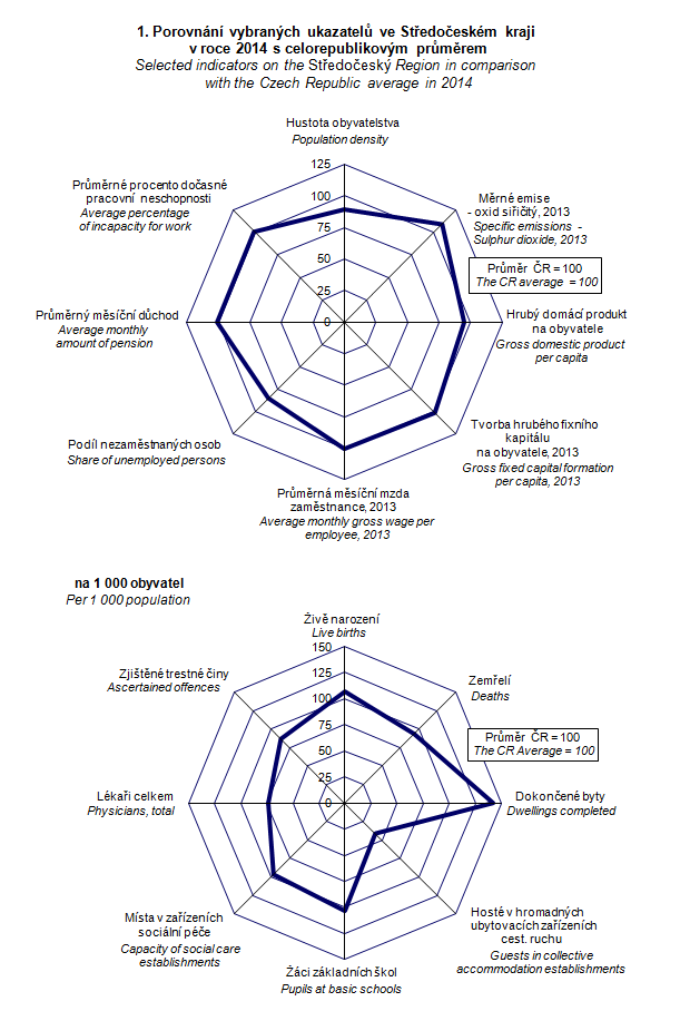 Graph 1. Selected indicators on the Středočeský Region in comparison with the Czech Republic average in 2014