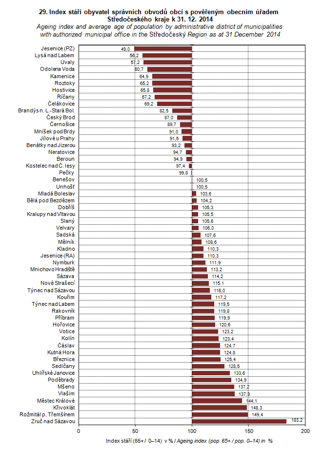 Graph 29. Ageing index and average age of population by administrative district of municipalities with authorized municipal office in the Středočeský Region as at 31 December 2014