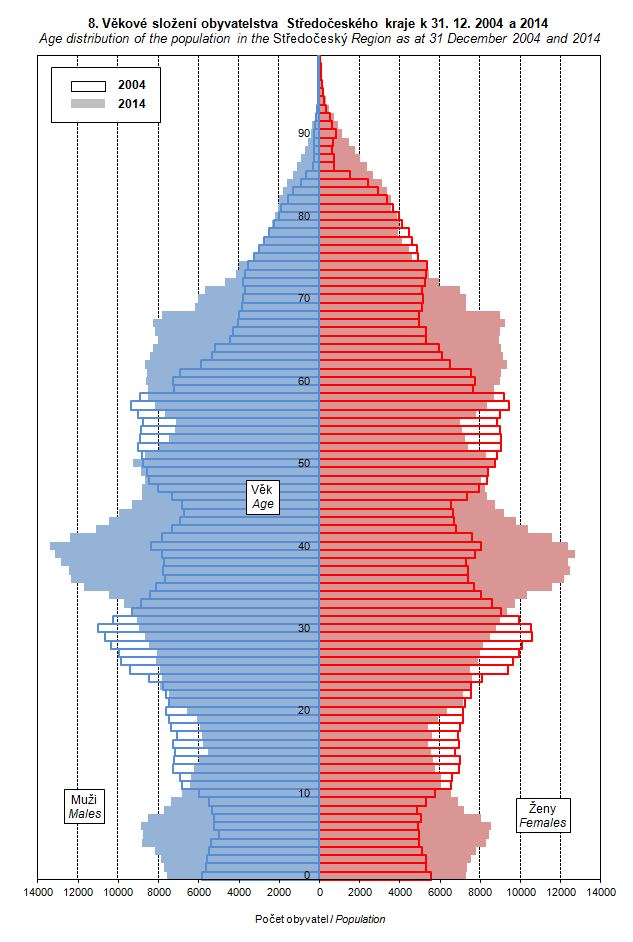 Graph 8. Age distribution of the population in the Středočeský Region as at 31 December 2004 and 2014