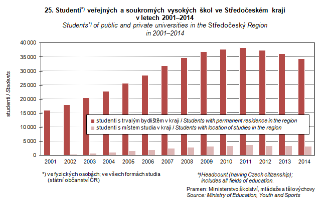 Graph 25. Students of public and private universities in the Středočeský Region in 2001–2014