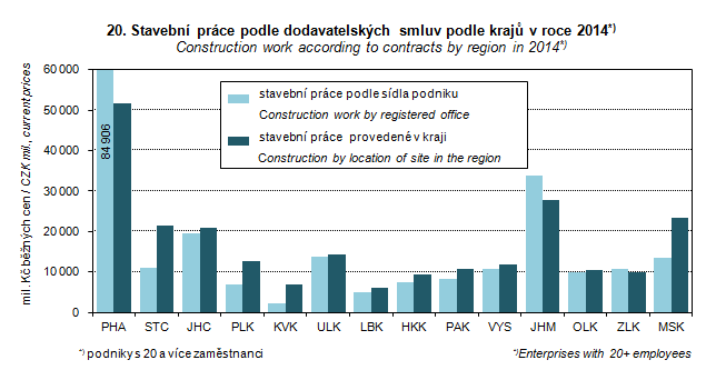 Graph 20. Construction work according to contracts by region in 2014