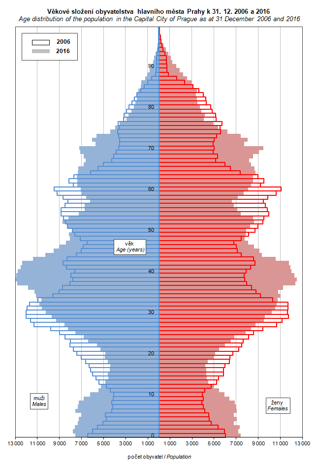 Graph 9. Age distribution of the population in the Capital City of Prague as at 31 December 2006 and 2016