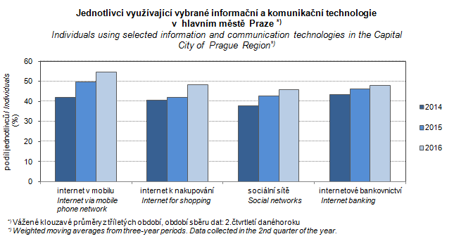 Graph 36. Individuals using selected information and communication technologies in the Capital City of Prague