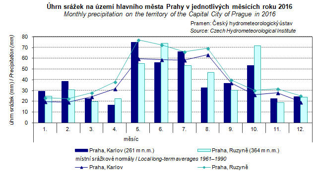 Graph 2. Monthly precipitation on the territory of the Capital City of Prague in 2016