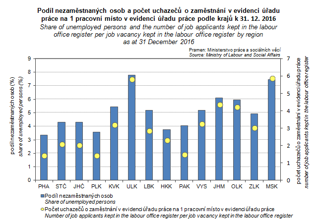 Graph 21. Share of unemployed persons (%) and number of job applicants per 1 job vacancy, by Region, as at 31 December 2016