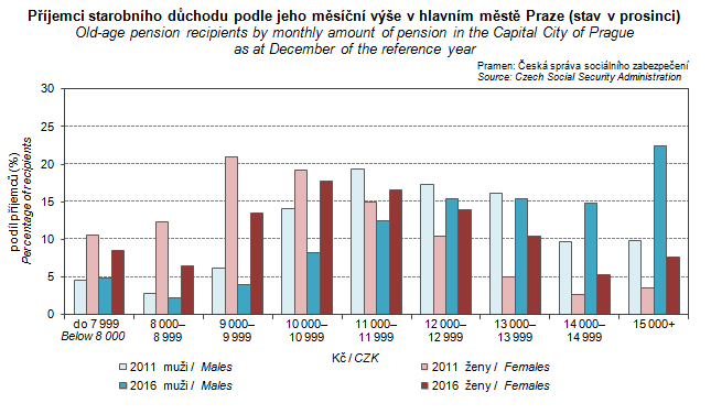 Graph 38. Old-age pension recipients by pension monthly amount in the Capital City of Prague (as at December)