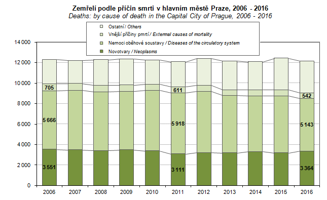 Graph 11. Deaths: by cause of death in the Capital City of Prague, 2006 - 2016