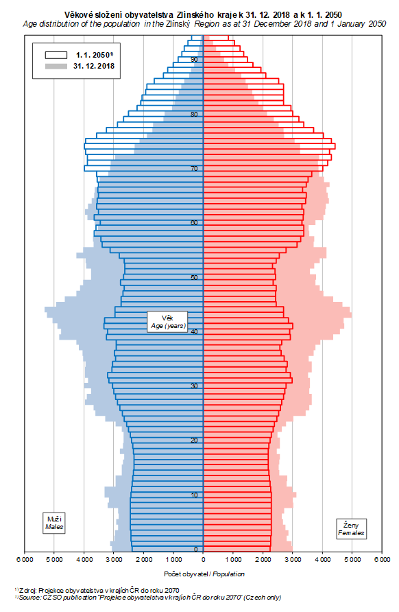 Graph 11. Age distribution of the population in the Zlínský Region as at 31 December 2018 and 1 January 2050