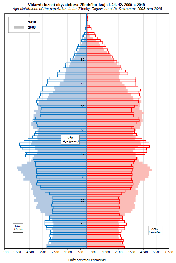 Graph 9. Age distribution of the population in the Zlínský Region as at 31 December 2008 and 2018
