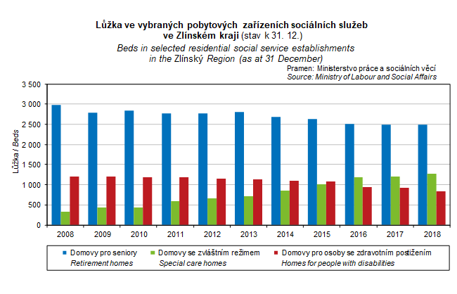 Graph 42. Beds in selected residential social service establishments in the Zlínský Region