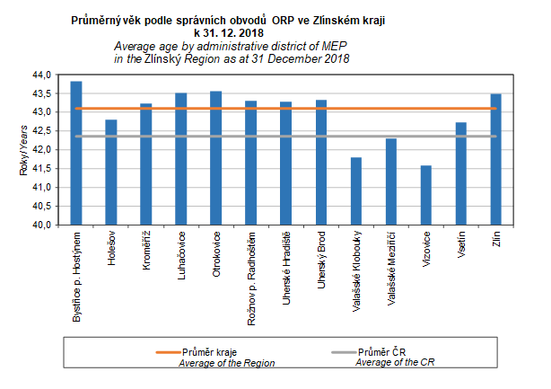 Graph 47. Average age by administrative district of MEP in the Zlínský Region as at 31 December 2018