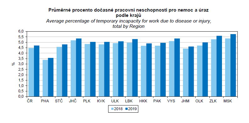 Graph 44. Average percentage of temporary incapacity for work due to disease or injury, total by Region