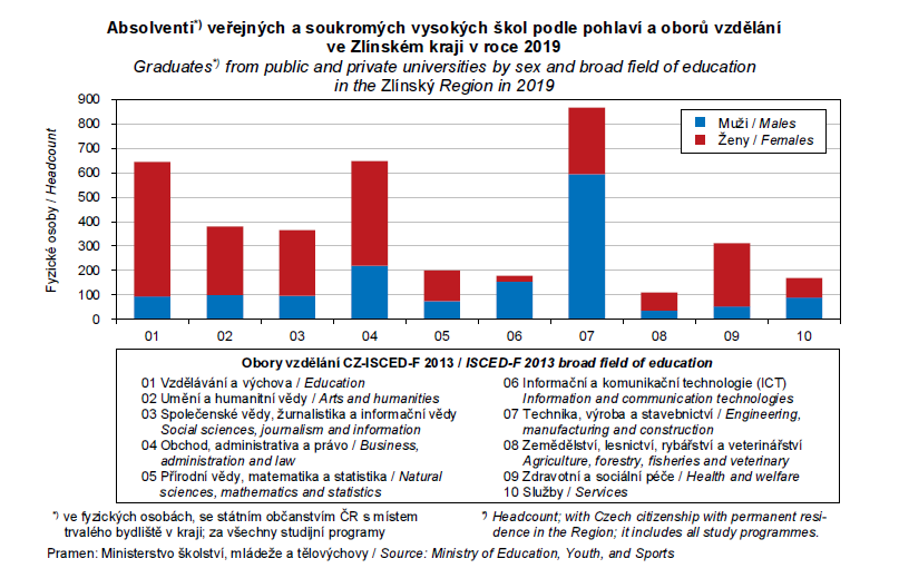 Graph 43. Graduates from public and private universities by sex and broad field of education in the Zlínský Region in 2019
