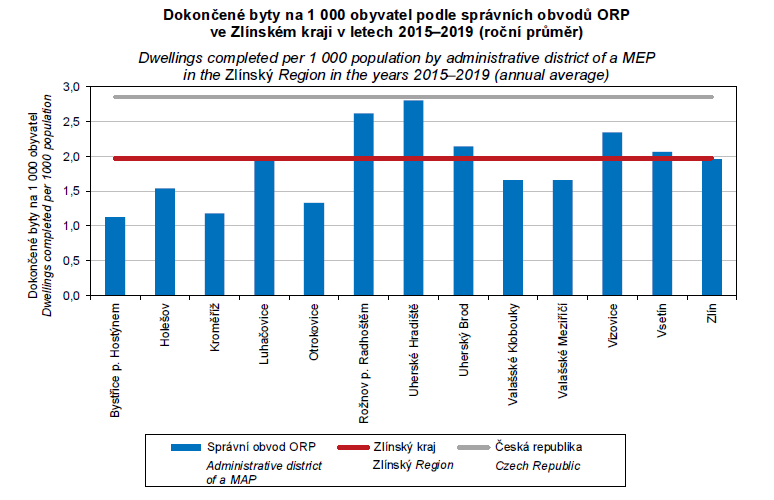 Graph 52. Dwellings completed per 1000 population by administrative district of a MEP in the Zlínský Region in the years 2015─2019 (annual average)
