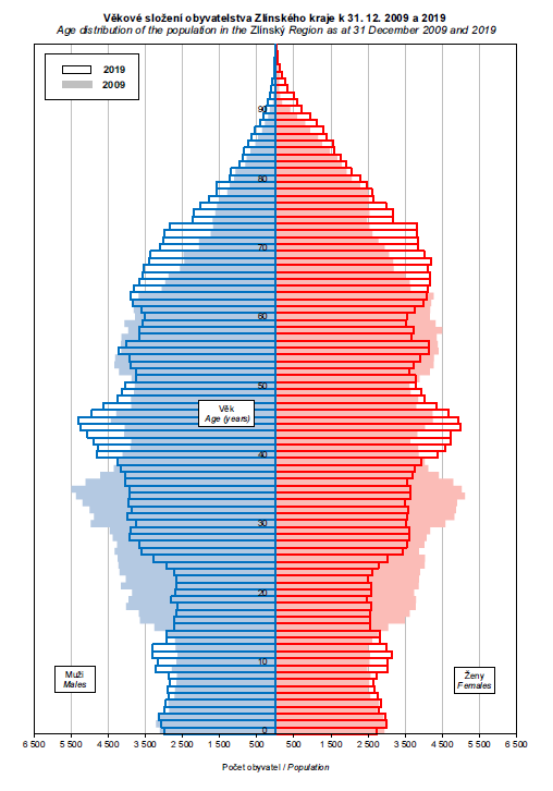 Graph 9. Age distribution of the population in the Zlínský Region as at 31 December 2009 and 2019