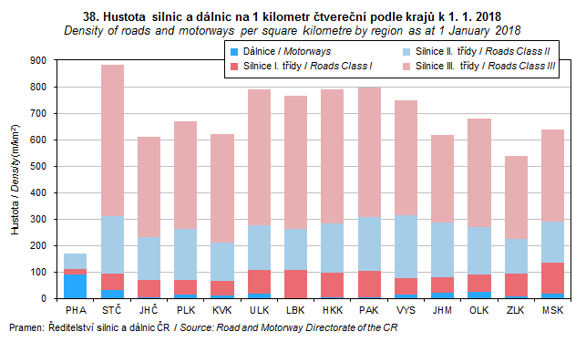 Graph 38. Density of roads and motorways per square kilometre by region as at 1 January 2018