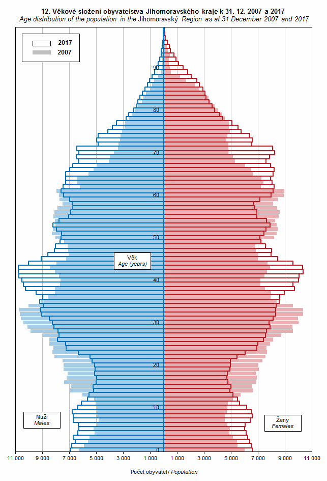 Graph 12. Age distribution of the population in the Jihomoravský Region as at 31 December 2007 and 2017