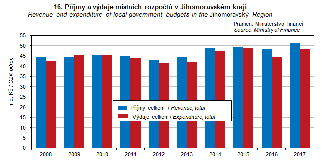 Graph 16. Revenue and expenditure of local government budgets in the Jihomoravský Region