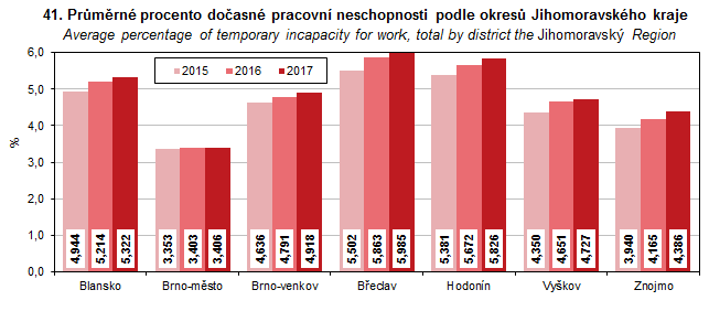 Graph 41. Average percentage of temporary incapacity for work, total by district the Jihomoravský Region