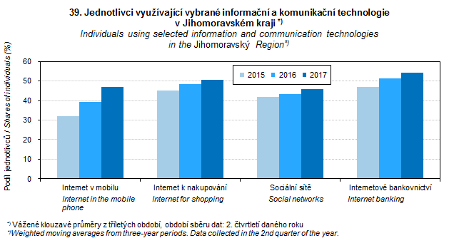 Graph 39. Individuals using selected information and communication technologies in the Jihomoravský Region