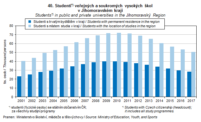 Graph 40. Students in public and private universities in the Jihomoravský Region