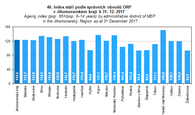 Graph 46. Ageing index (pop. 65+/pop. 0–14) by administrative district of MEP in the Jihomoravský Region as at 31 Decebmer 2017