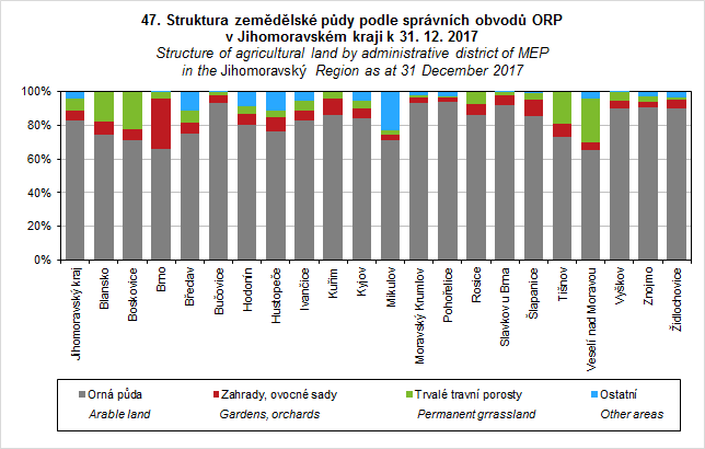 Graph 47. Structure of agricultural land by administrative district of MEP in the Jihomoravský Region as at 31 December 2017