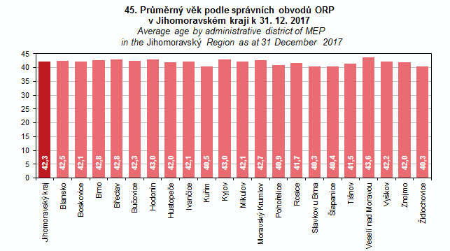 Graph 45. Average age by administrative district of MEP in the Jihomoravský Region as at 31 December 2017