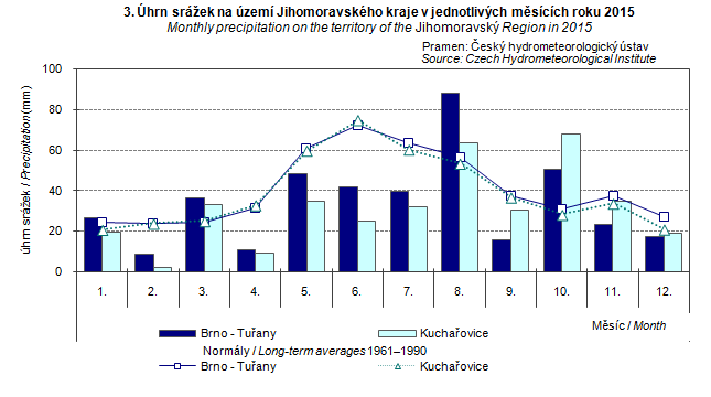 Graph 3. Monthly precipitation on the territory of the Jihomoravský Region in 2015