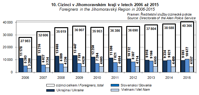 Graph 10. Foreigners in the Jihomoravský Region in 2006–2015