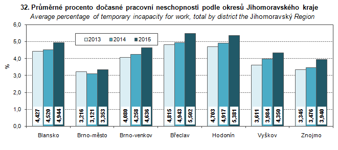 Graph 32. Average percentage of temporaty incapacity for work, total by cistrict the Jihomoravský region