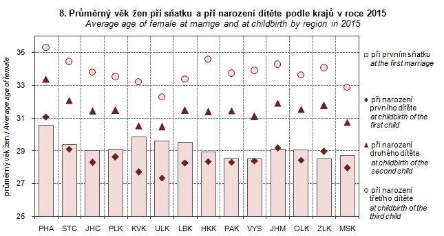 Graph 8. Average age of female at marrige and at childbirth by region in 2015