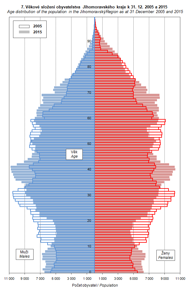 Graph 7. Age distribution of the population in the Jihomoravský Region as at 31 December 2005 and 2015