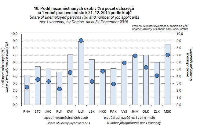 Graph 18. Share of unemployed persons (%) and number of job applicants per 1 vacancy, by Region, as at 31 December 2015