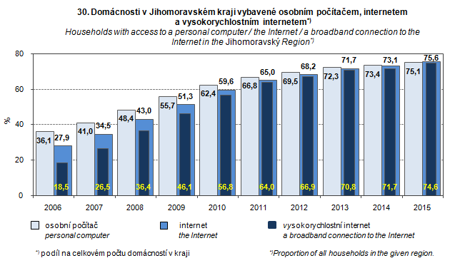 Graph 30. Households with access to a personal computer / the Internet / a broadband connection to the Internet in the Jihomoravský Region