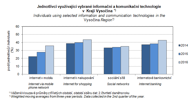 Graph 36. Individuals using selected information and communication technologies in the Vysočina Region