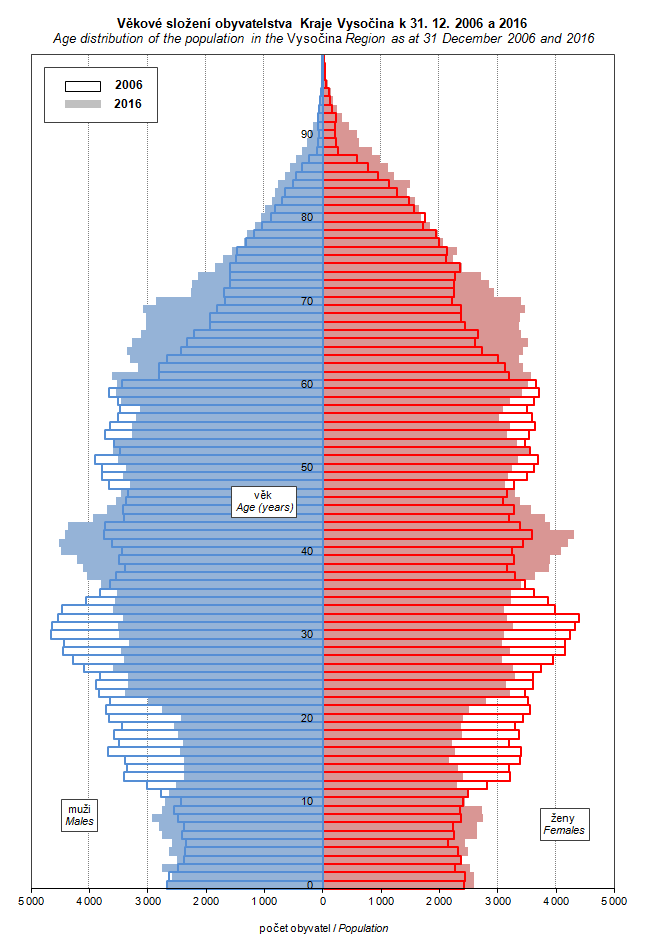 Graph 9. Age distribution of the population in the Vysočina Region as at 31 December 2006 and 2016