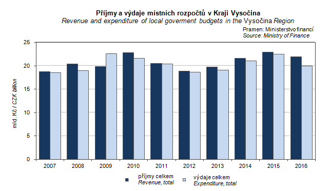 Graph 14. Revenue and expenditure of local goverment budgets in the Vysočina Region